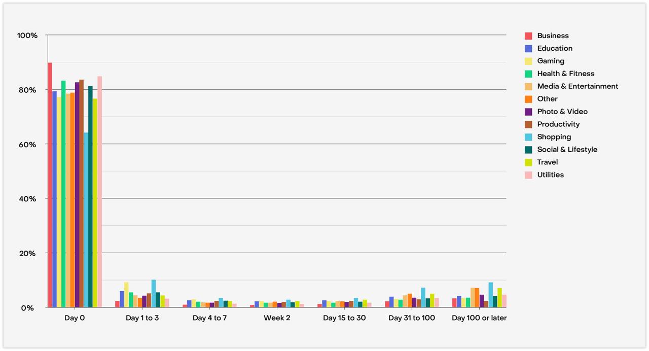 Лояльнее всего люди к категориям Бизнес, Утилиты и Продуктивность. К шоппингу присматриваются дольше всего.