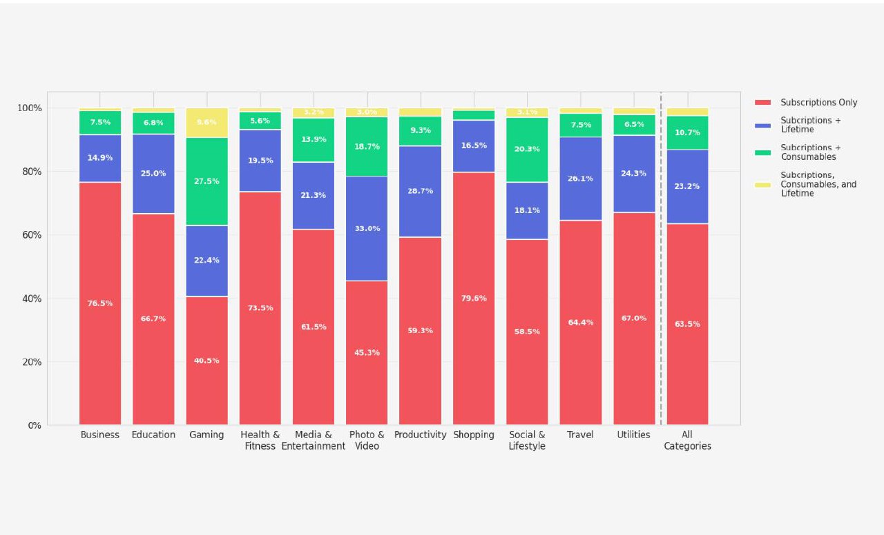 • 33% комбинируют подписки + lifetime (самый высокий показатель).